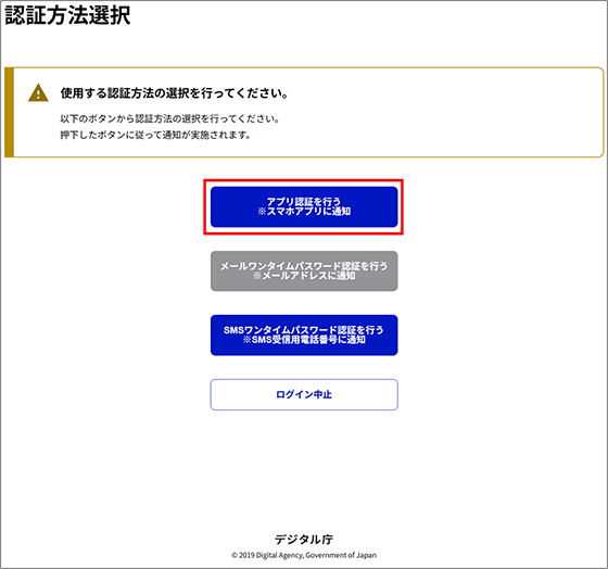 (1) GビズIDや行政サービスにログインすると、認証方法選択画面が表示されます。「アプリ認証を行う」ボタンをクリックします